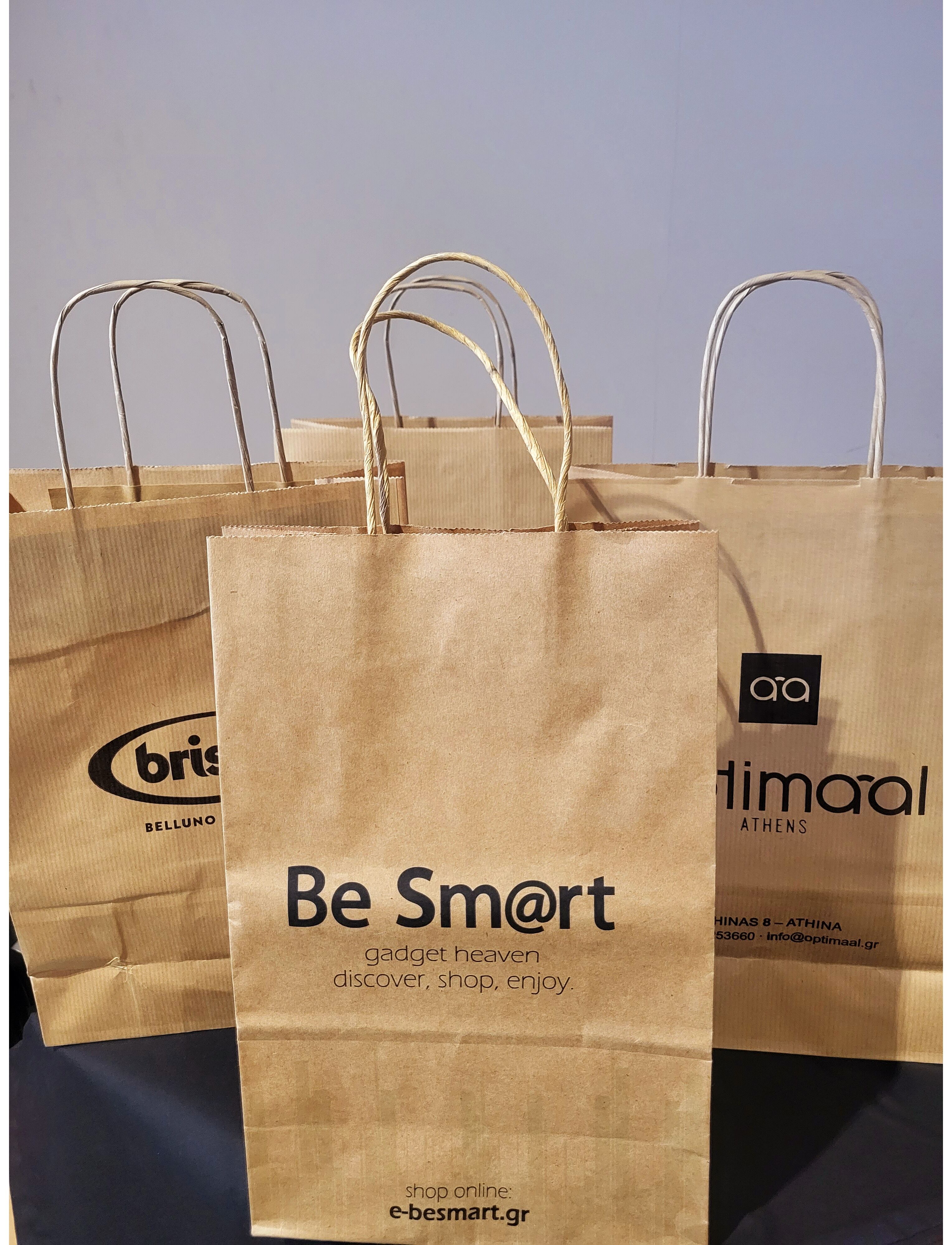 Σακούλες σε καφέ χρώμα με στριφτό χεράκι κατάλληλες για κάθε είδους κατάστημα/επιχείρηση τυπωμένες με το λογότυπό σας ώστε να δώσετε ταυτότητα στο εμπόρευμά σας.